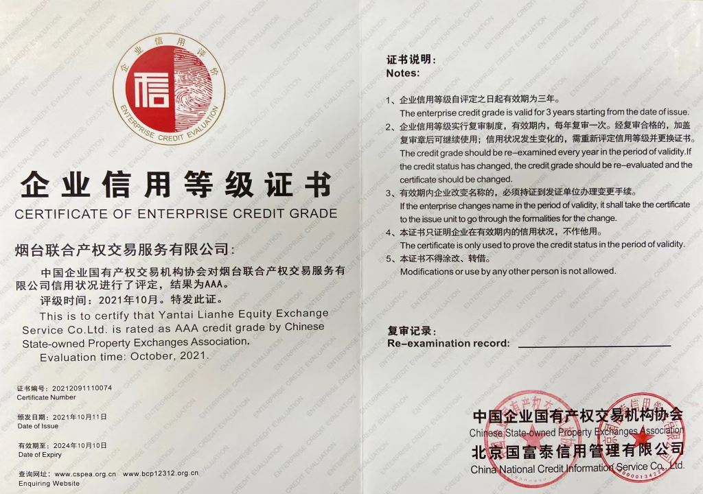 2022年產(chǎn)權(quán)交易行業(yè)信用評價(jià)復(fù)審結(jié)果在全國行業(yè)信用公共服務(wù)平臺(tái)和中國產(chǎn)權(quán)網(wǎng)進(jìn)行公示,煙臺(tái)聯(lián)合產(chǎn)權(quán)在協(xié)會(huì)信用評價(jià)復(fù)審中,繼續(xù)維持AAA級評定不變。