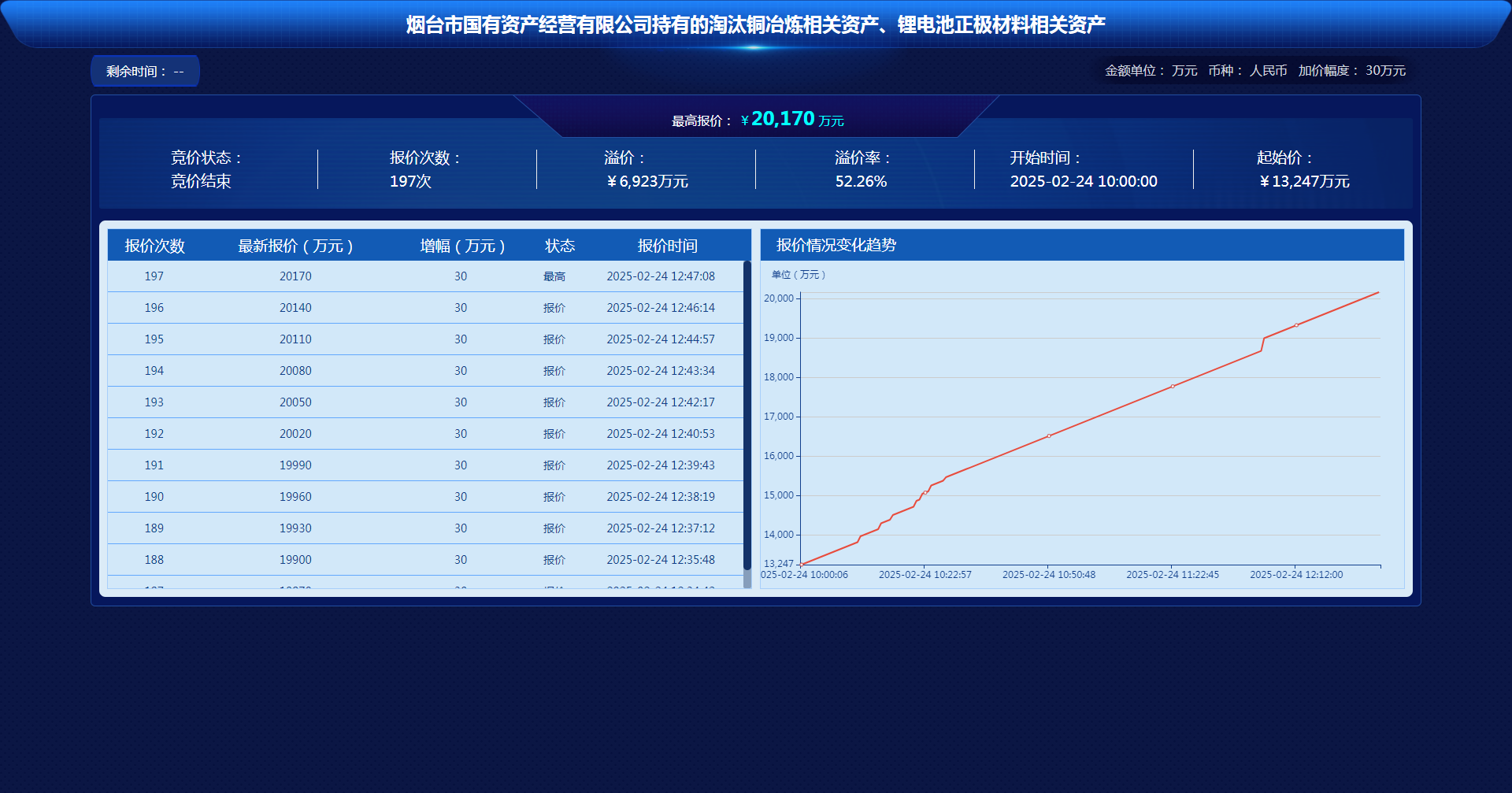 2月24日,“煙臺(tái)市國有資產(chǎn)經(jīng)營有限公司持有的淘汰銅冶煉相關(guān)資產(chǎn)、鋰電池正極材料相關(guān)資產(chǎn)項(xiàng)目”在山東產(chǎn)權(quán)交易中心以網(wǎng)絡(luò)競價(jià)方式成功出讓。此次交易歷經(jīng)197輪激烈競價(jià),持續(xù)近3小時(shí),最終成交金額定格在20170萬元,高于評(píng)估價(jià)8980萬元,較掛牌價(jià)溢價(jià)6923萬元,溢價(jià)率高達(dá)52.26%,成功創(chuàng)下煙臺(tái)聯(lián)合產(chǎn)權(quán)2025年首季資產(chǎn)盤活的“開門紅”。